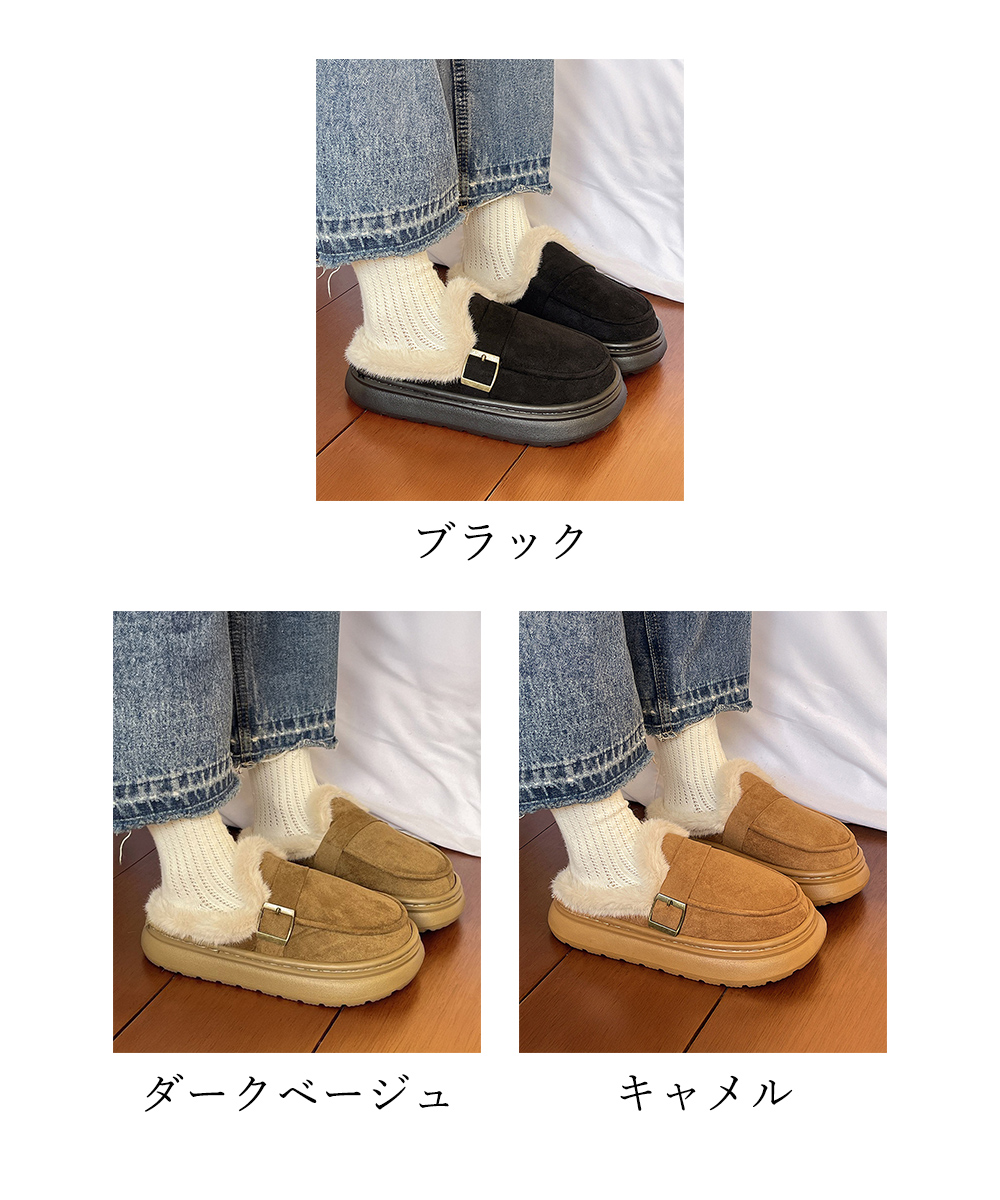 プラットシューズ パンプス ぺたんこ ふわふわ 暖かい 美脚 オシャレ カジュアル靴 痛くない 歩きやすい 軽量靴 ルームシューズ 冷え対策保温防寒靴 疲れないスリッポン ふわふわファーを内側に施した、足元をあたためてくれるルームスリッパです。 厚みのあるソールでクッション性が高く、歩きやすく快適なはき心地です。 リラックスタイムにぴったりな一足です。 甲素材:合成繊維 底素材:合成底 カラー:ブラック/キャメル/ダークベージュ サイズ:S(36-37)/M(38-39)/L(40-41) (カッコ内は靴底表記となります) [S]対応サイズ:23.0cm/23.5cm 外寸長さ:約25.0cm 幅:約8.6cm [M]対応サイズ:24.0cm/24.5cm 外寸長さ:約26.0cm 幅:約8.8cm [L]対応サイズ:25.0cm/25.5cm 外寸長さ:約27.0cm 幅:約9.0cm ヒール(全サイズ):約2.5cm プラットフォーム(全サイズ):約2.3cm 重さ(両足):約224g-250g