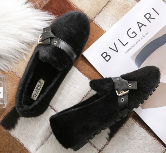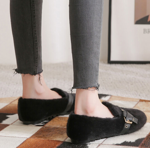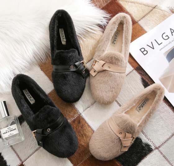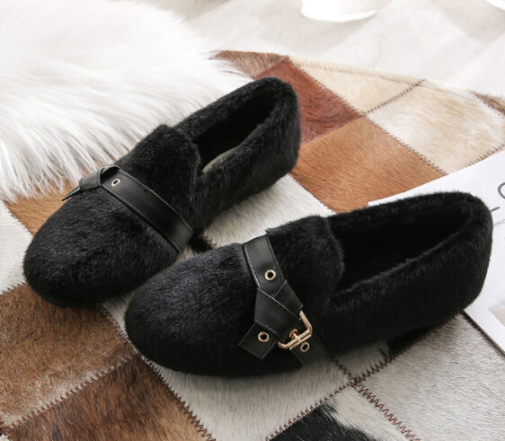 ふわふわファーとベルトデザインがトレンド感を演出し、フラットソールで歩きやすさも抜群。